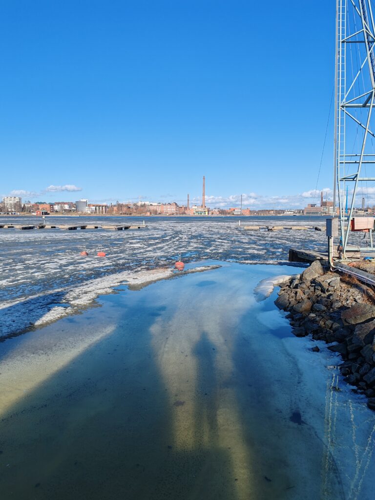 Ja kyllä. Satamassa ja sen edustalla jäät näyttävät jo kohtuu haurailta.